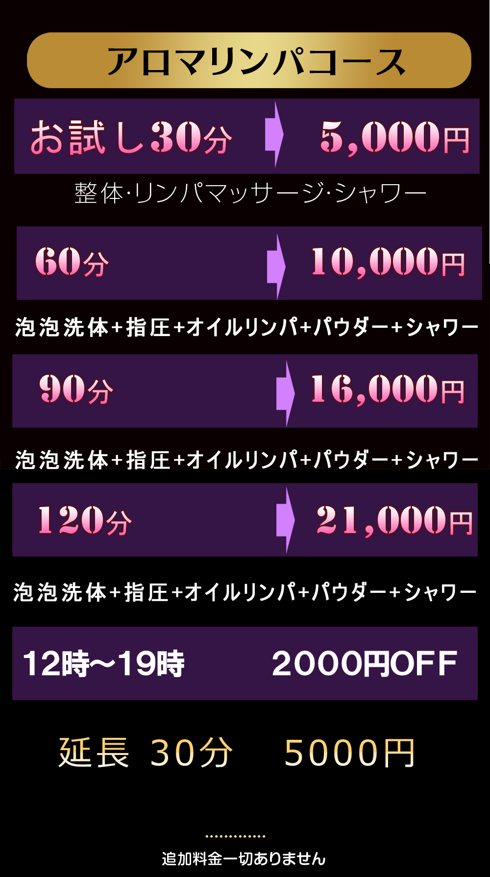 ※ご来店後のコース時間短縮はご対応出来ません。ご予約時にお伝えした料金を頂戴させて頂きます。変更がある場合は必ずご来店前にお電話でお申し付け下さい。